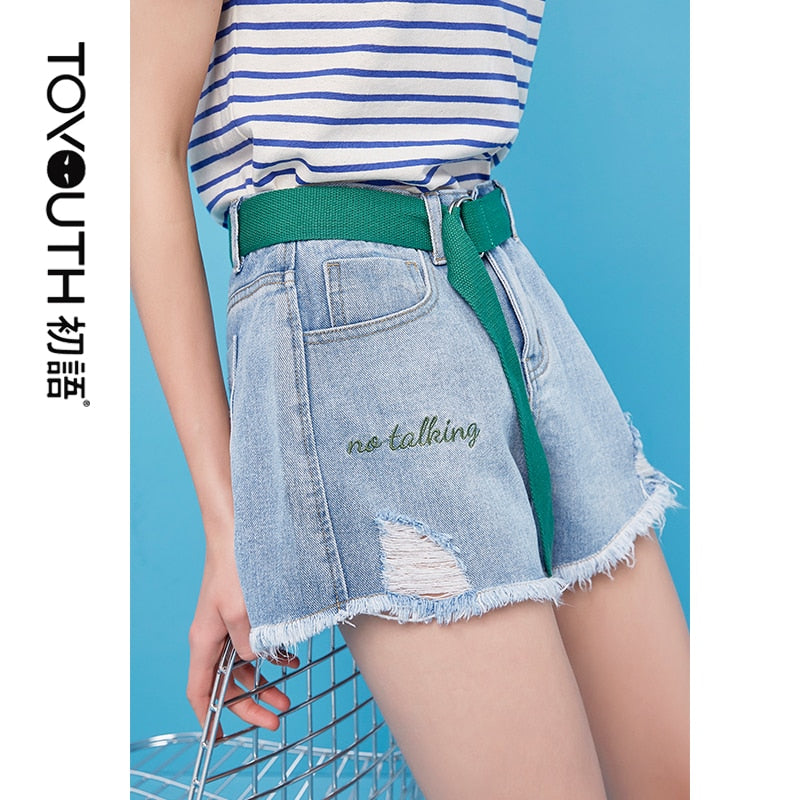Toyouth 2019 Summer Denim Shorts Women Jeans Ripped Shorts Fashion Letter Embroidery High Waist Loose Hot Shorts with Belt